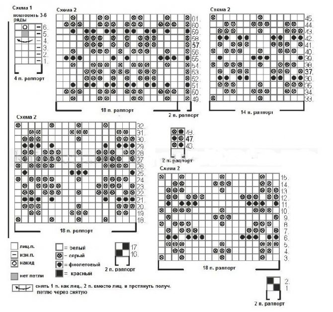 Делаем: 1р. красным, 1р. фиолетовым. Дальше – по сх. №2 с 46-го по 48-ой р. При этом в 46-ом р убавить одну п.